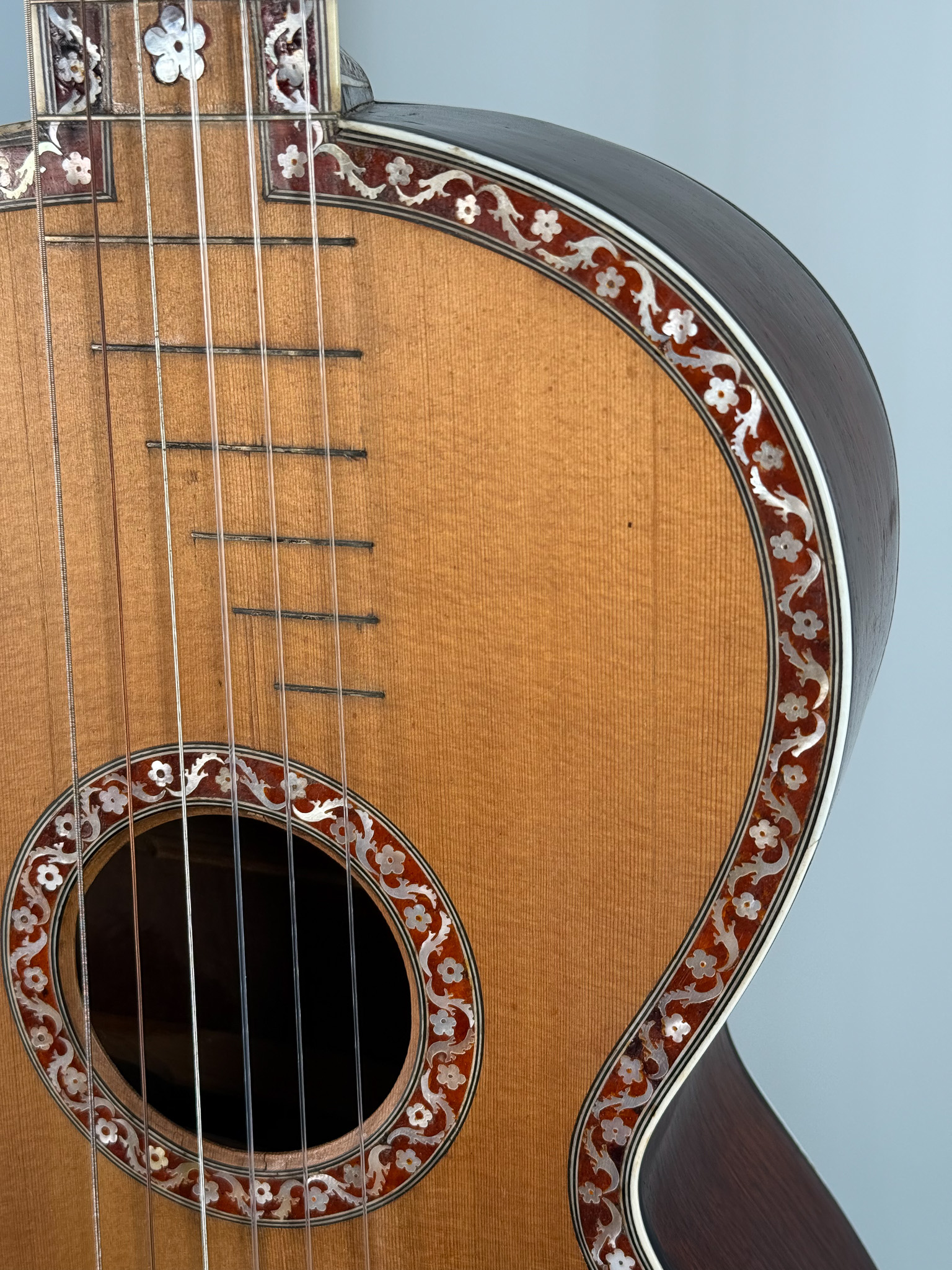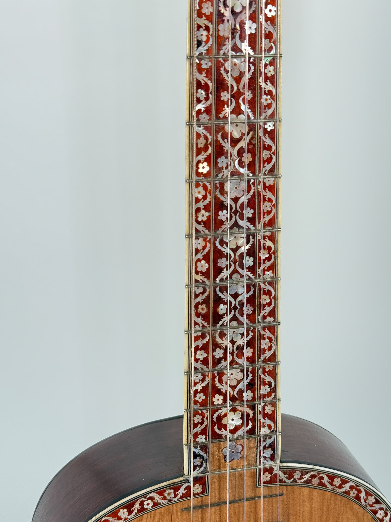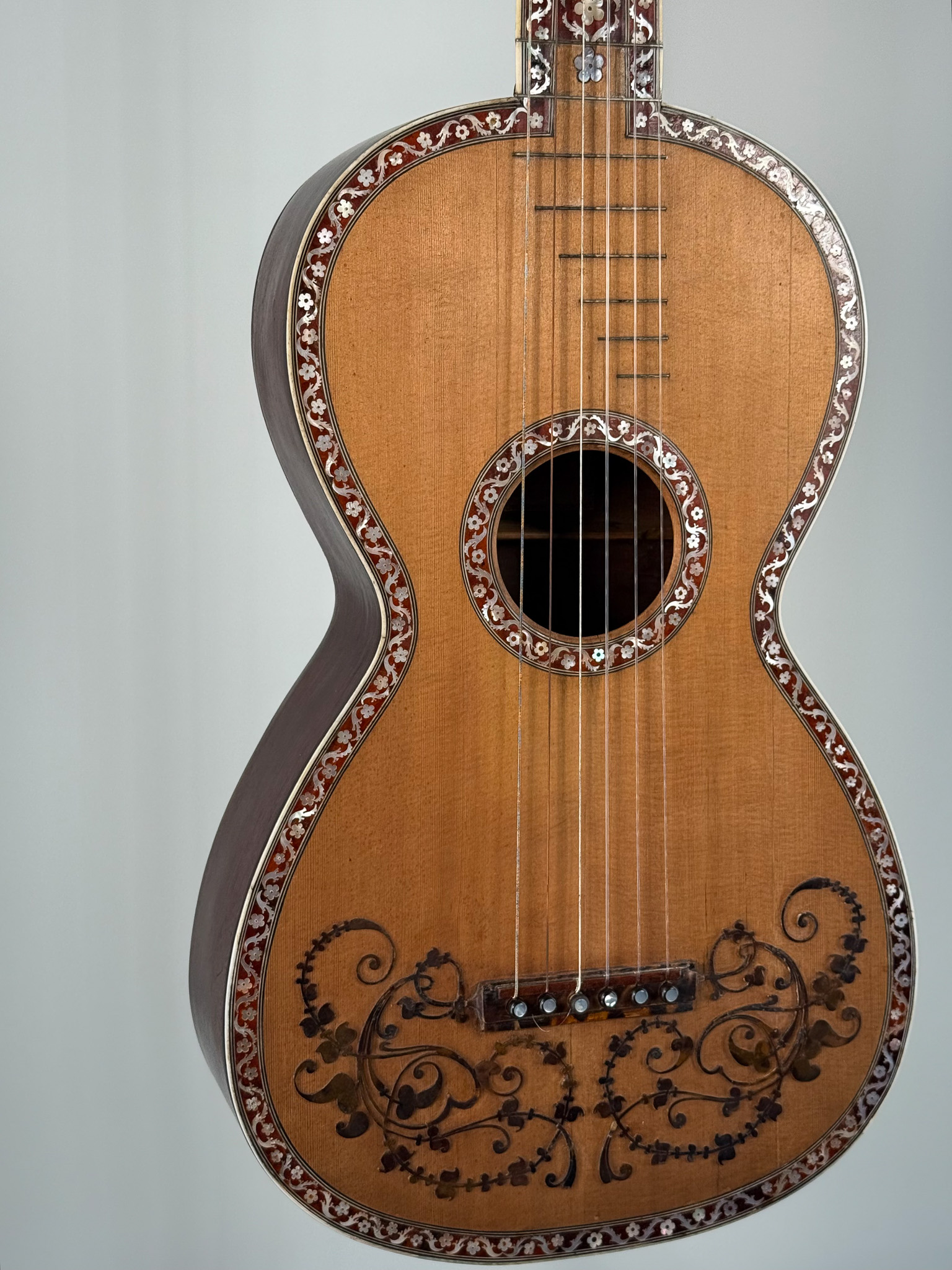 Fabricatore’s guitars are admired for their light construction, lyrical tone, and elegant Neapolitan design. They produce a sweet, intimate sound ideal for salon music and the expressive style of the Romantic era. He was among the early adopters of six single strings and fan bracing, both of which influenced later guitar evolution.