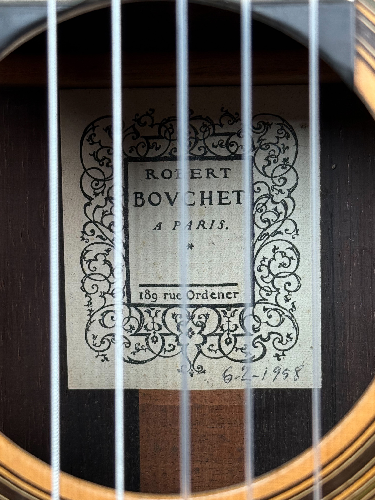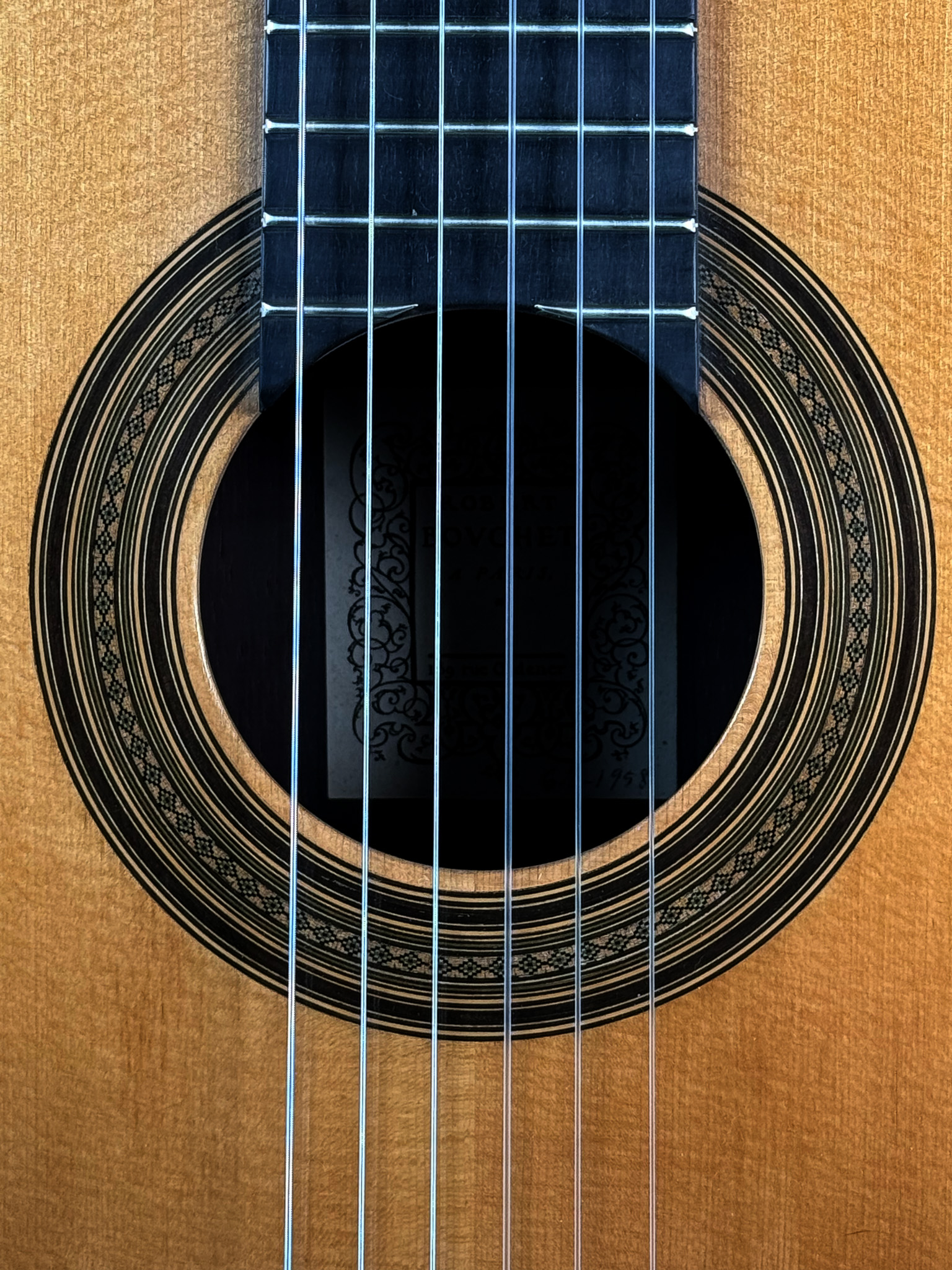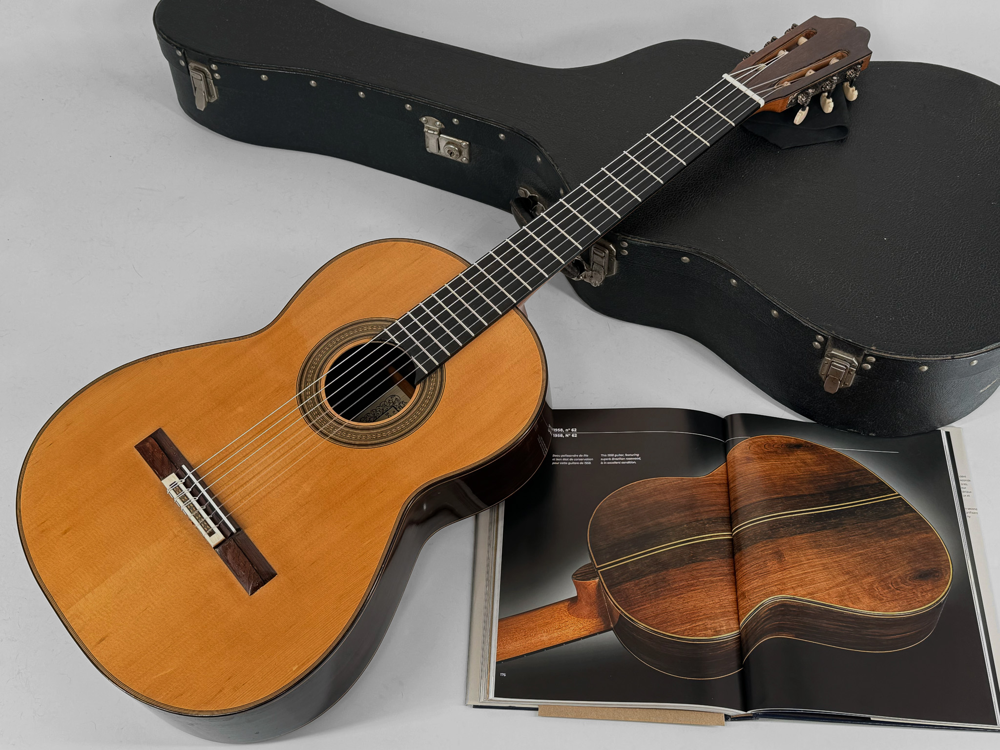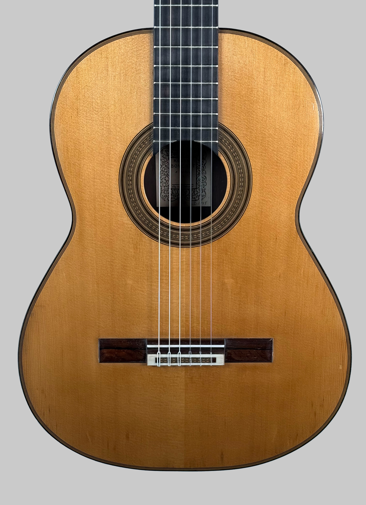 No. 62 was constructed during Bouchet’s mature period, immediately preceding some of his most celebrated instruments. It sits alongside masterpieces such as Ida Presti’s 1958 Bouchet (No. 63) and Alexandre Lagoya’s 1959 Bouchet, both of which remain preserved in the Musée de la Musique, Paris.
